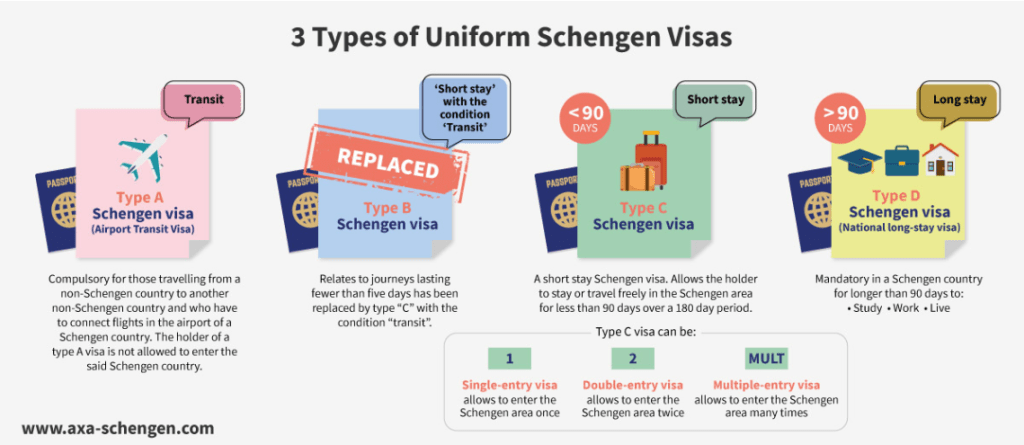 - Type D Schengen visa: Long stay, for longer than 90 days